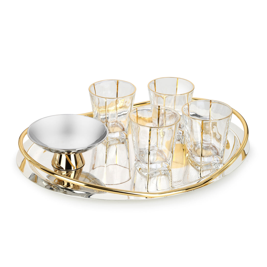 Intricate Design Oval Tray with Handle with Small Server and 4 Whiskey Glasses