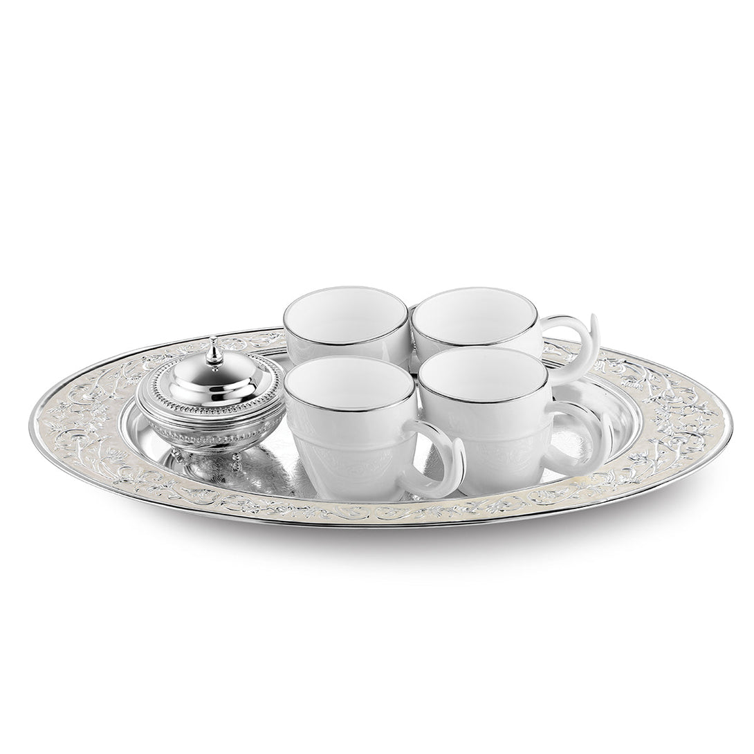 Oval MOP tray L + 4 white cups + sugar bowl MOP