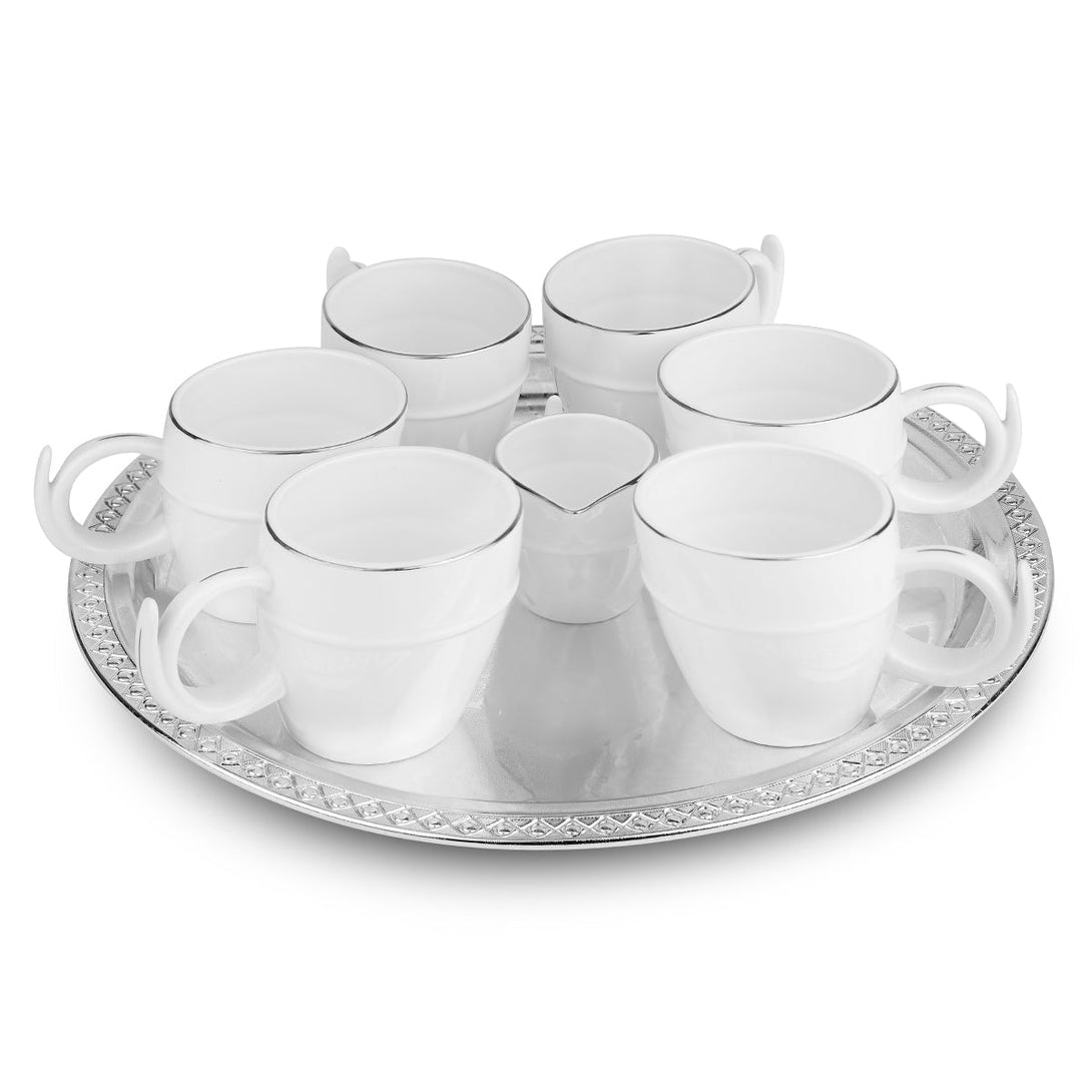 Round Silver Thal With 6 Tea Cups + 1 Milk Pot